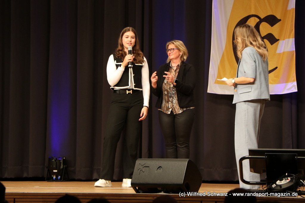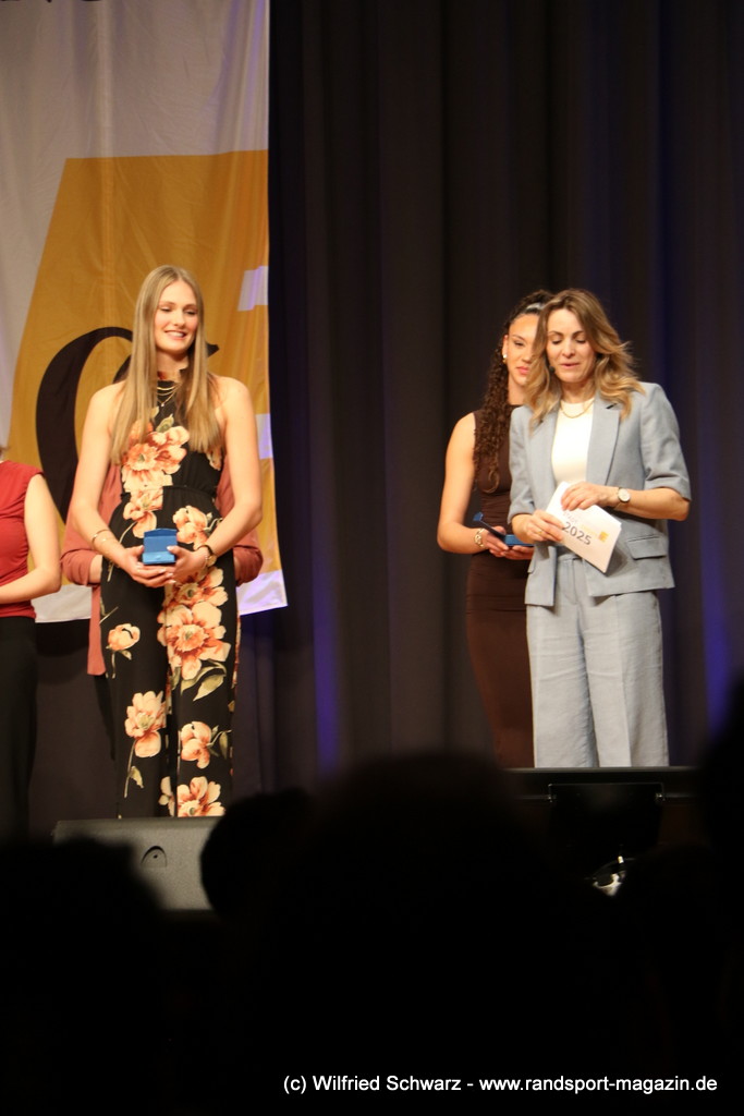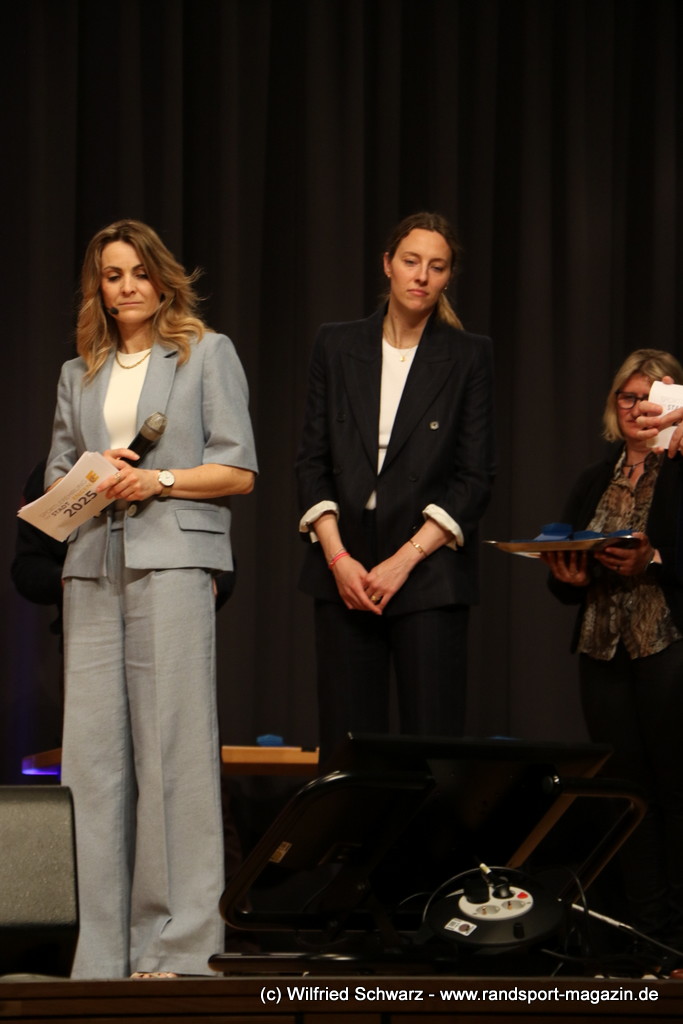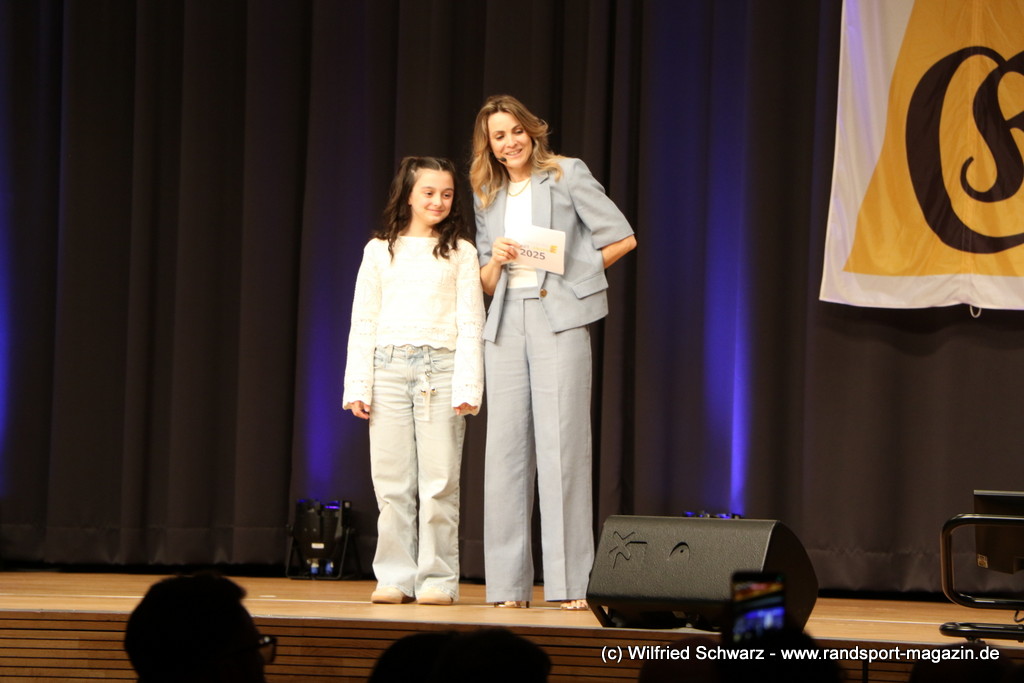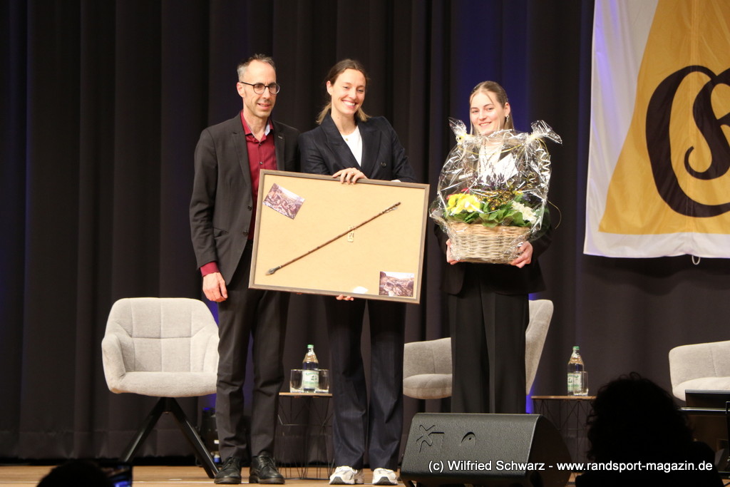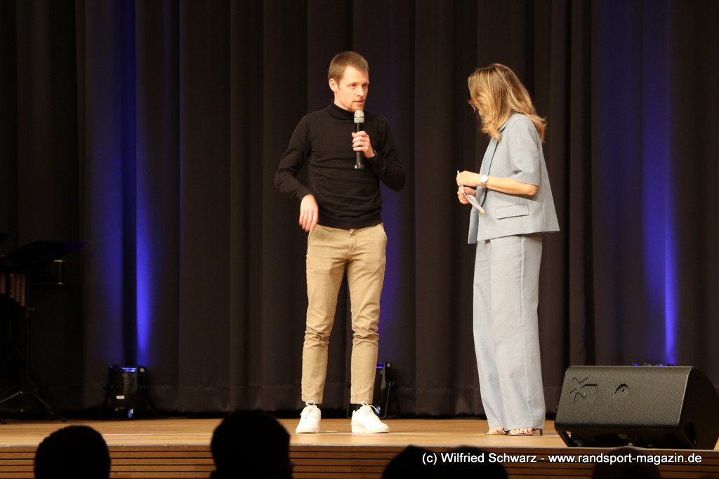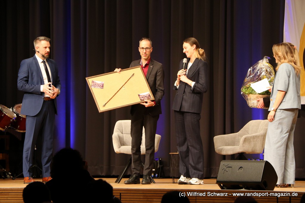 Gekonnt, charmant und mit sportlichem Sachverstand moderiert wurde der Abend von Isabel Meier-Lang und Philipp Gaiser, die auch Leonie Beck, einer der erfolgreichsten deutschen Freiwasser-Schwimmerinnen, begrüßen durften. Leonie Beck. Die aus Augsburg stammende Schwimmerin begann ihre Karriere im Beckenschwimmen, bevor sie sich dann auf das Freiwasserschwimmen spezialisierte. Sie gehört zu den erfolgreichsten deutschen Freiwasser-Schwimmerinnen der Gegenwart. Sie nahm bereits an drei Olympischen Spielen teil und gewann zahlreiche Medaillen bei Europa- und Weltmeisterschaften. Sie erzählte im Interview mit den beiden Moderatoren über Hochs und Tiefs in ihrem Sport. Auch im Freischwimmen musste sie viel über Taktik lernen, um an der richtigen Stelle um die Bojen zu schwimmen oder während eines 10 KM Rennens – das knapp 2 Stunden dauert- Nahrung aufzunehmen. In einer Trainingsgruppe in Rom (Italien) fand sie nach Corona die Richtige Motivation. Auch über ihre größte Niederlage bei den Olympischen Spielen 2024 in Paris sprach sie. „Das war nicht meins, da musste man viel gegen den Strom schwimmen,“ so Leonie Beck. „Für die eine Strecke auf der Seine brauchte man 2 Minuten, während man in die andere Richtung 15 Minuten benötigte“. Sie gab auch den anwesenden Sportlern einen Rat. „Vergesst nicht nebenher eine Ausbildung oder Studium zu machen“, sprach sie auch ihrer Erfahrung. „Habt immer noch einen Plan B neben dem Sport in der Tasche.“ Derzeit konzentriert sie sich auf ihr Studium, ist daneben noch Markenbotschafter für einen Sportartikel-Hersteller, bietet Eventbesuche an und hält an verschiedenen Events Vorträge. (www.leonie-beck.de)