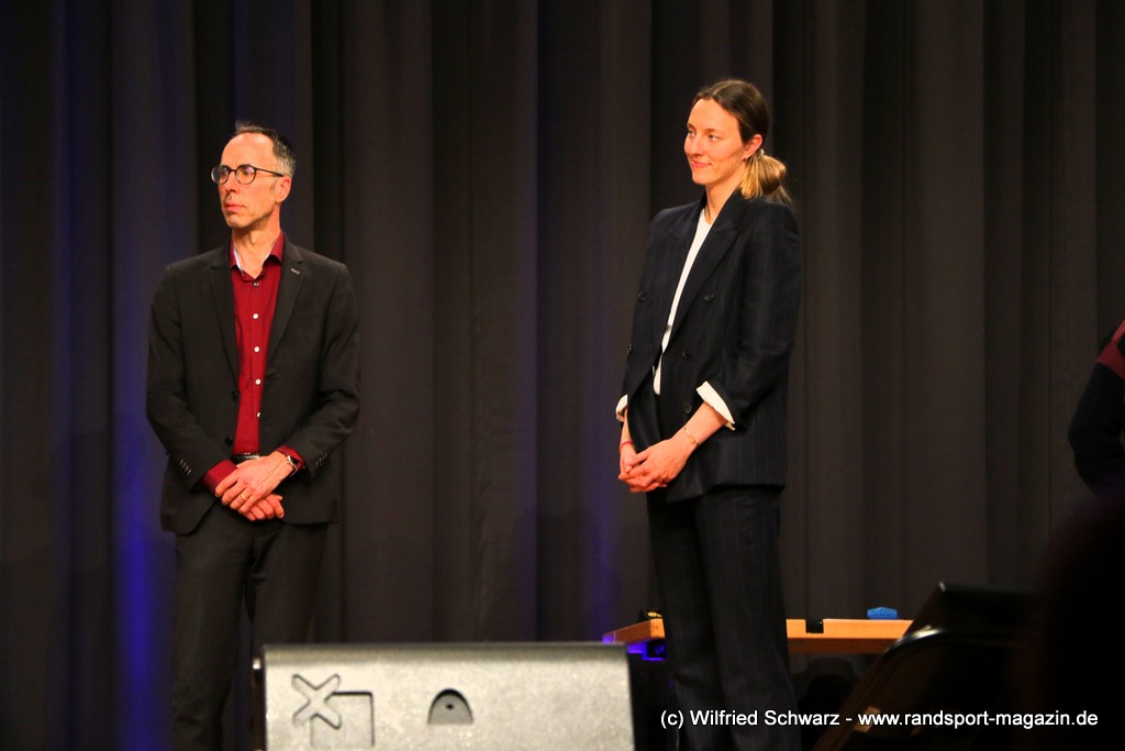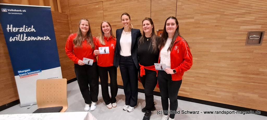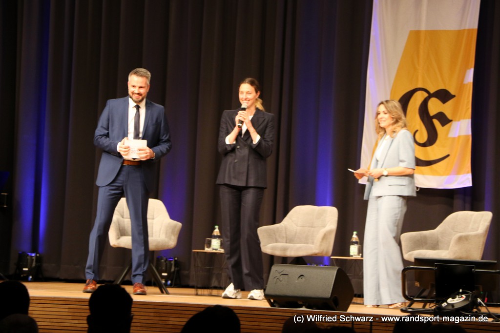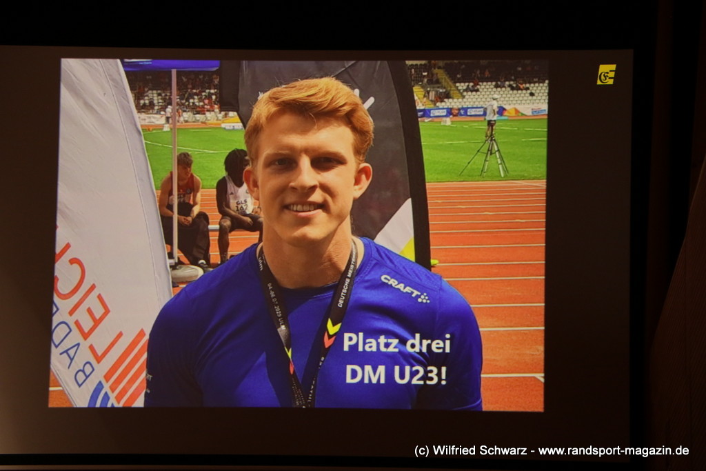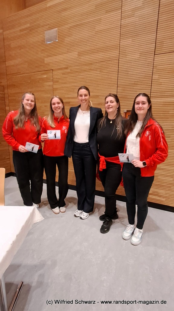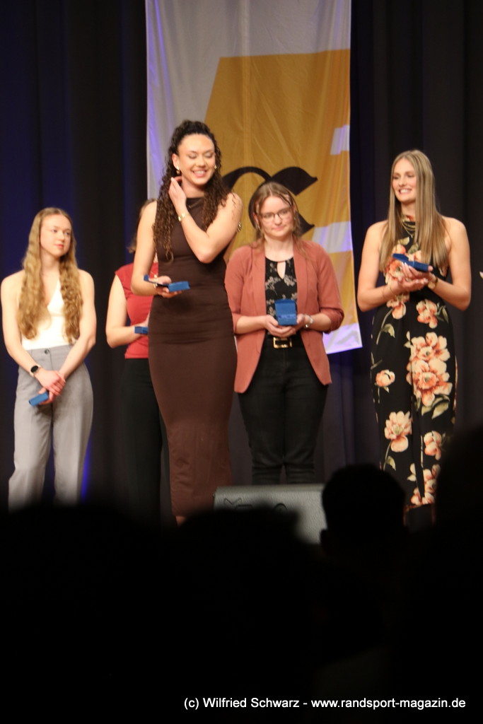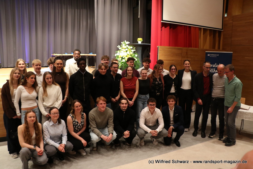 Gekonnt, charmant und mit sportlichem Sachverstand moderiert wurde der Abend von Isabel Meier-Lang und Philipp Gaiser, die auch Leonie Beck, einer der erfolgreichsten deutschen Freiwasser-Schwimmerinnen, begrüßen durften. Leonie Beck. Die aus Augsburg stammende Schwimmerin begann ihre Karriere im Beckenschwimmen, bevor sie sich dann auf das Freiwasserschwimmen spezialisierte. Sie gehört zu den erfolgreichsten deutschen Freiwasser-Schwimmerinnen der Gegenwart. Sie nahm bereits an drei Olympischen Spielen teil und gewann zahlreiche Medaillen bei Europa- und Weltmeisterschaften. Sie erzählte im Interview mit den beiden Moderatoren über Hochs und Tiefs in ihrem Sport. Auch im Freischwimmen musste sie viel über Taktik lernen, um an der richtigen Stelle um die Bojen zu schwimmen oder während eines 10 KM Rennens – das knapp 2 Stunden dauert- Nahrung aufzunehmen. In einer Trainingsgruppe in Rom (Italien) fand sie nach Corona die Richtige Motivation. Auch über ihre größte Niederlage bei den Olympischen Spielen 2024 in Paris sprach sie. „Das war nicht meins, da musste man viel gegen den Strom schwimmen,“ so Leonie Beck. „Für die eine Strecke auf der Seine brauchte man 2 Minuten, während man in die andere Richtung 15 Minuten benötigte“. Sie gab auch den anwesenden Sportlern einen Rat. „Vergesst nicht nebenher eine Ausbildung oder Studium zu machen“, sprach sie auch ihrer Erfahrung. „Habt immer noch einen Plan B neben dem Sport in der Tasche.“ Derzeit konzentriert sie sich auf ihr Studium, ist daneben noch Markenbotschafter für einen Sportartikel-Hersteller, bietet Eventbesuche an und hält an verschiedenen Events Vorträge. (www.leonie-beck.de)
