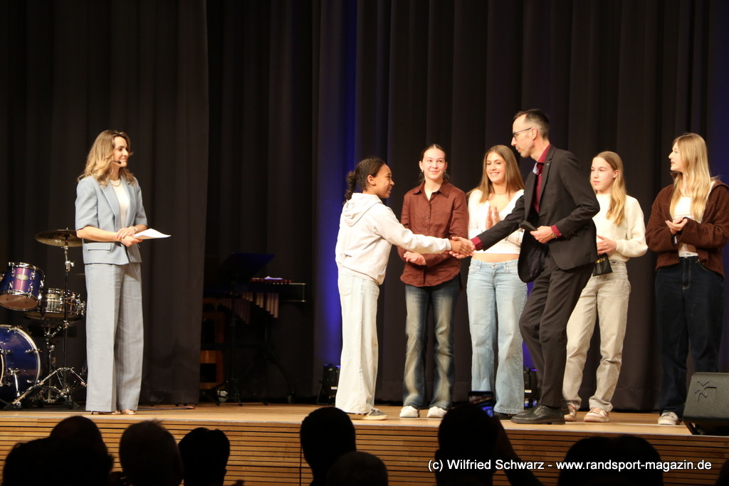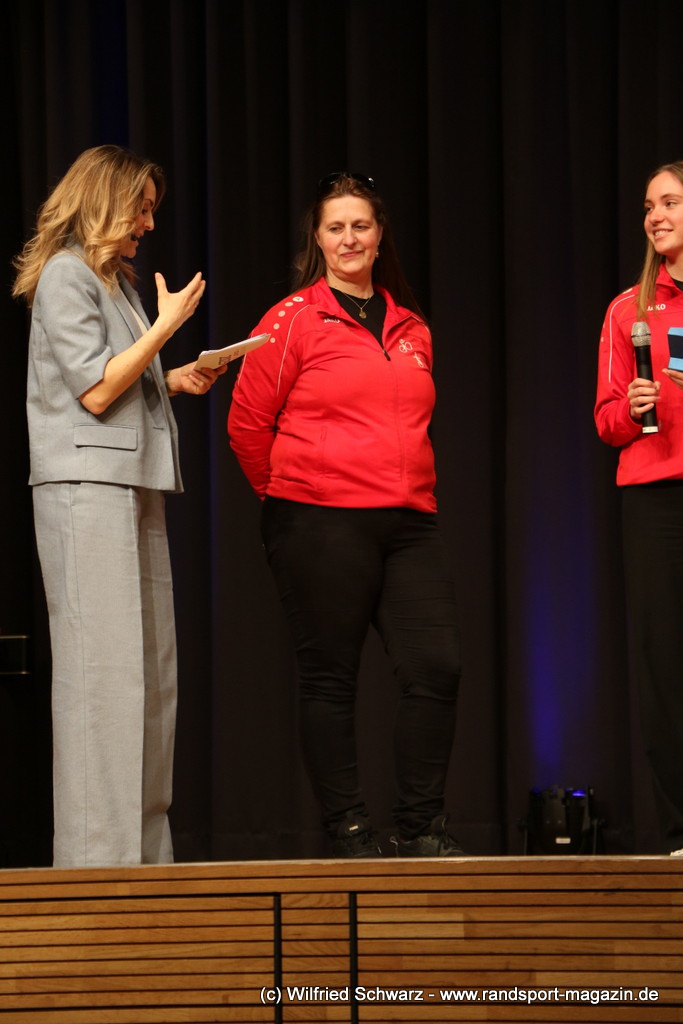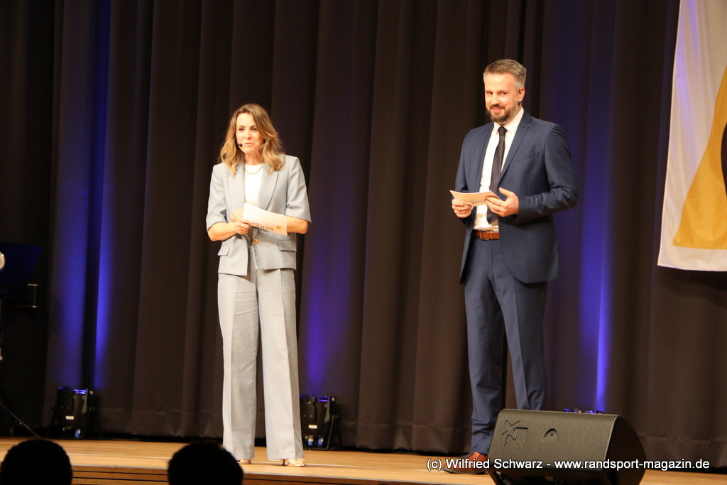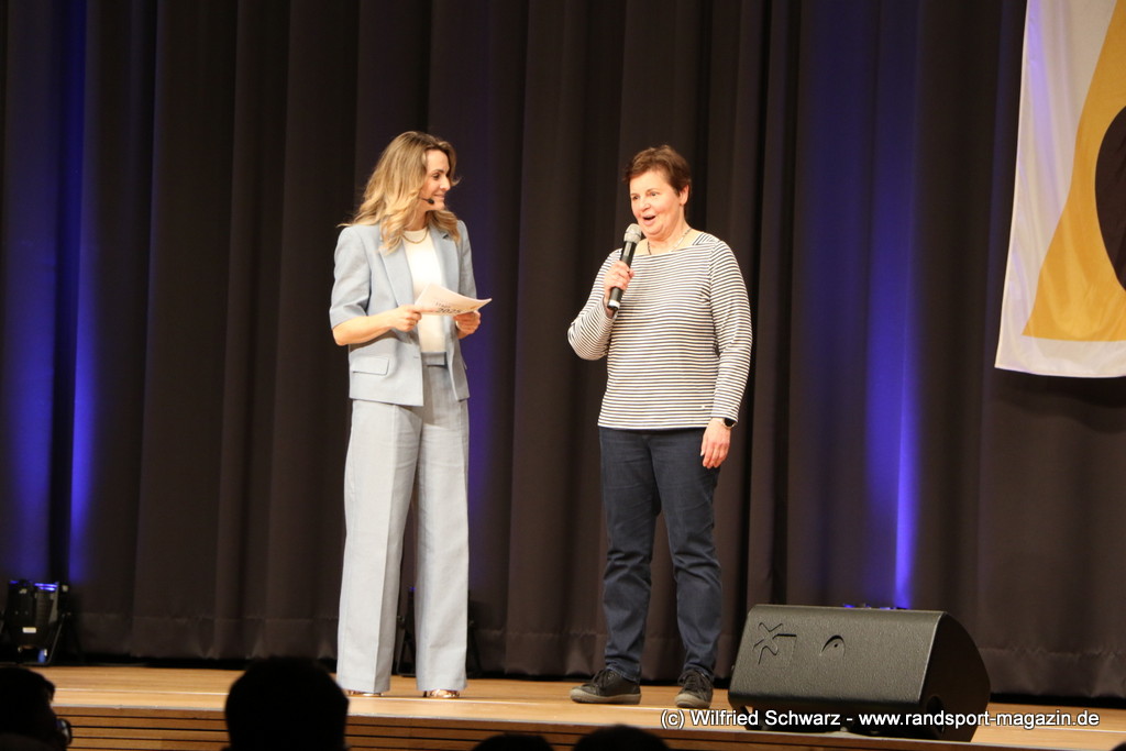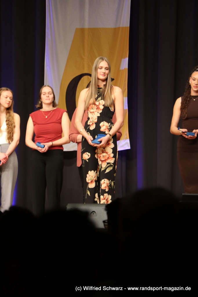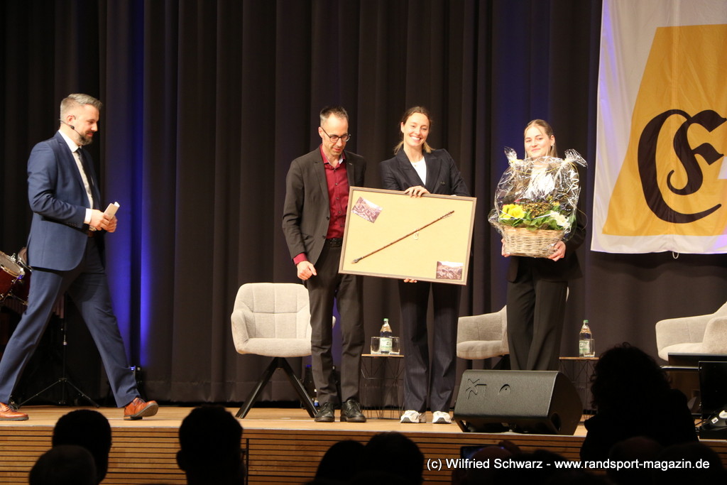 Gekonnt, charmant und mit sportlichem Sachverstand moderiert wurde der Abend von Isabel Meier-Lang und Philipp Gaiser, die auch Leonie Beck, einer der erfolgreichsten deutschen Freiwasser-Schwimmerinnen, begrüßen durften. Leonie Beck. Die aus Augsburg stammende Schwimmerin begann ihre Karriere im Beckenschwimmen, bevor sie sich dann auf das Freiwasserschwimmen spezialisierte. Sie gehört zu den erfolgreichsten deutschen Freiwasser-Schwimmerinnen der Gegenwart. Sie nahm bereits an drei Olympischen Spielen teil und gewann zahlreiche Medaillen bei Europa- und Weltmeisterschaften. Sie erzählte im Interview mit den beiden Moderatoren über Hochs und Tiefs in ihrem Sport. Auch im Freischwimmen musste sie viel über Taktik lernen, um an der richtigen Stelle um die Bojen zu schwimmen oder während eines 10 KM Rennens – das knapp 2 Stunden dauert- Nahrung aufzunehmen. In einer Trainingsgruppe in Rom (Italien) fand sie nach Corona die Richtige Motivation. Auch über ihre größte Niederlage bei den Olympischen Spielen 2024 in Paris sprach sie. „Das war nicht meins, da musste man viel gegen den Strom schwimmen,“ so Leonie Beck. „Für die eine Strecke auf der Seine brauchte man 2 Minuten, während man in die andere Richtung 15 Minuten benötigte“. Sie gab auch den anwesenden Sportlern einen Rat. „Vergesst nicht nebenher eine Ausbildung oder Studium zu machen“, sprach sie auch ihrer Erfahrung. „Habt immer noch einen Plan B neben dem Sport in der Tasche.“ Derzeit konzentriert sie sich auf ihr Studium, ist daneben noch Markenbotschafter für einen Sportartikel-Hersteller, bietet Eventbesuche an und hält an verschiedenen Events Vorträge. (www.leonie-beck.de)