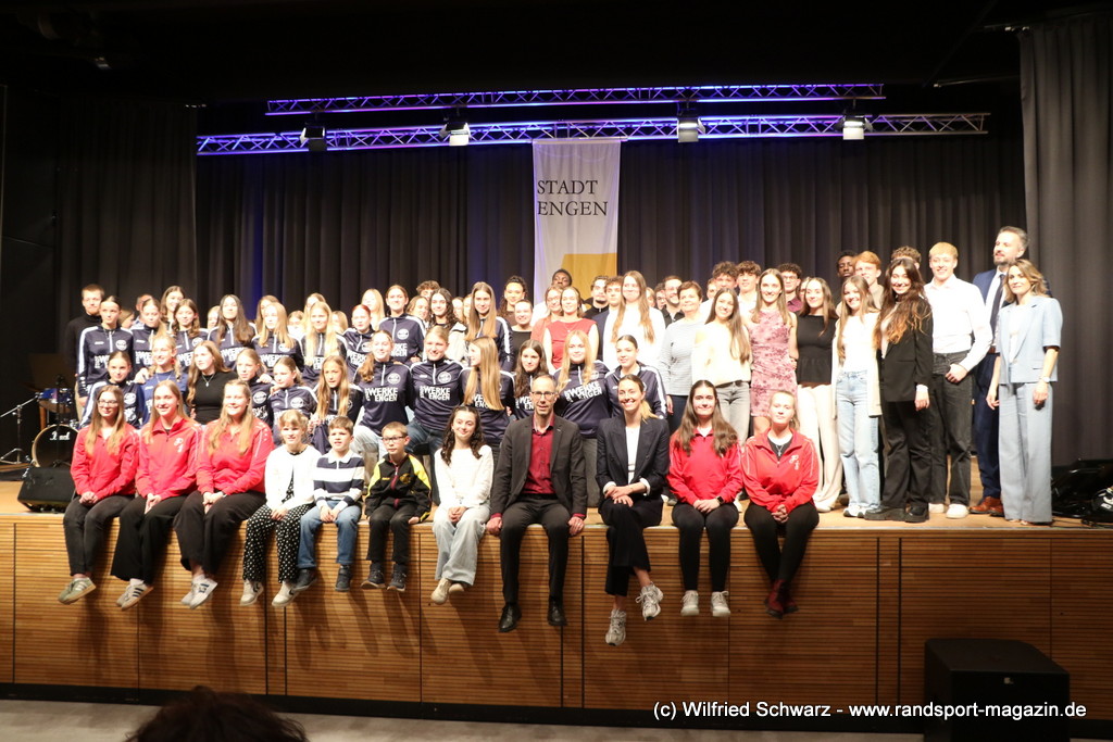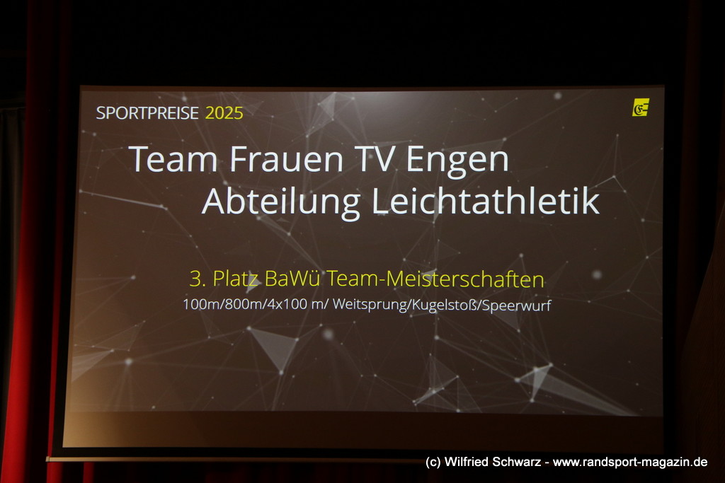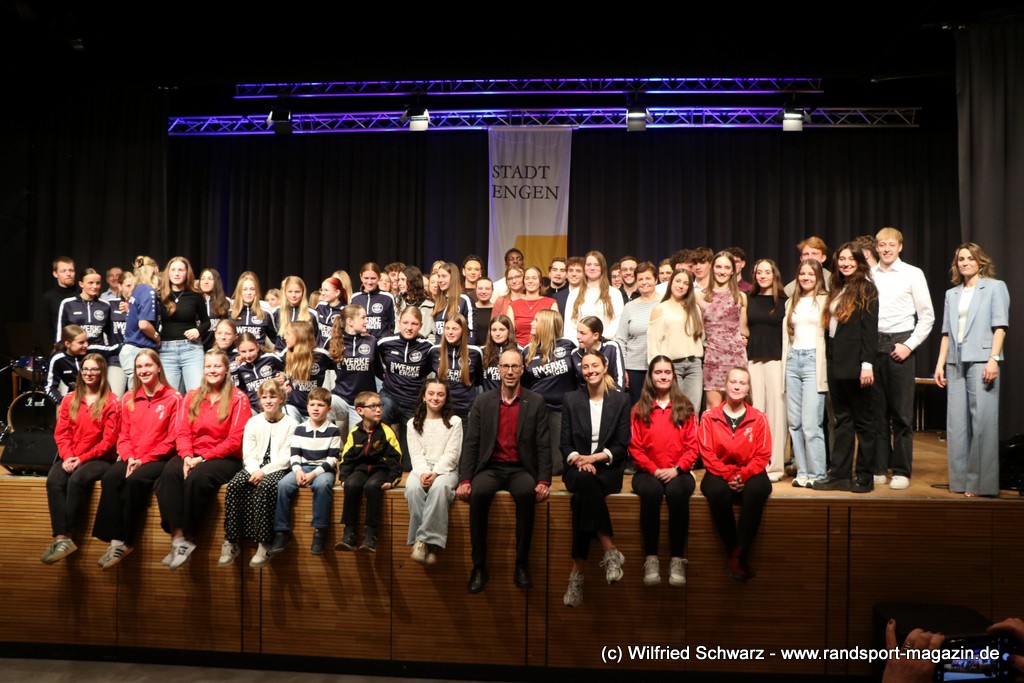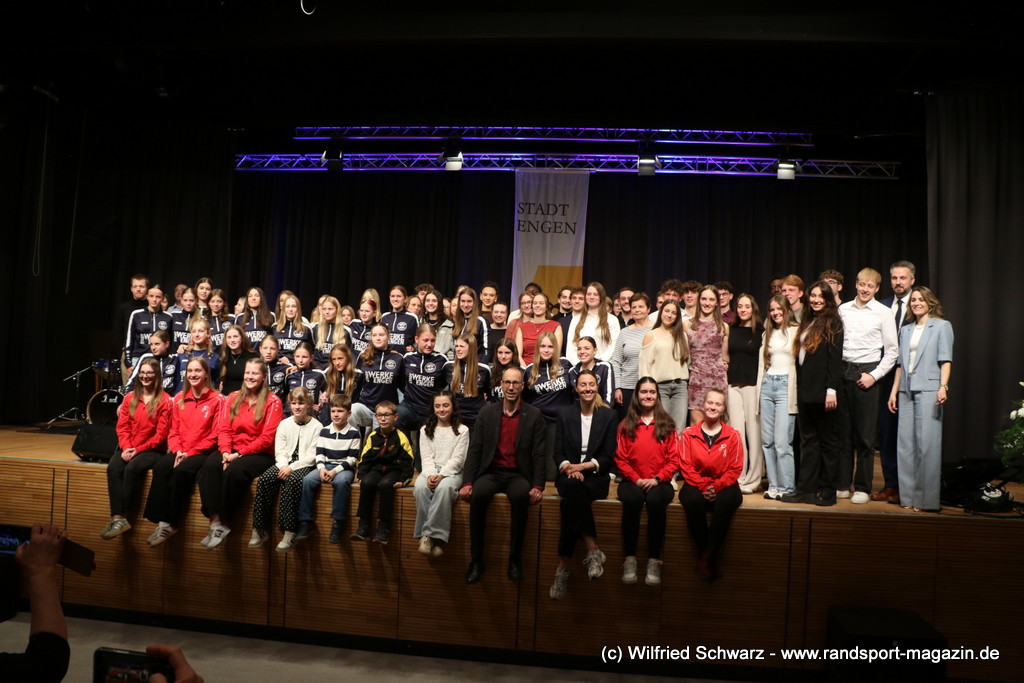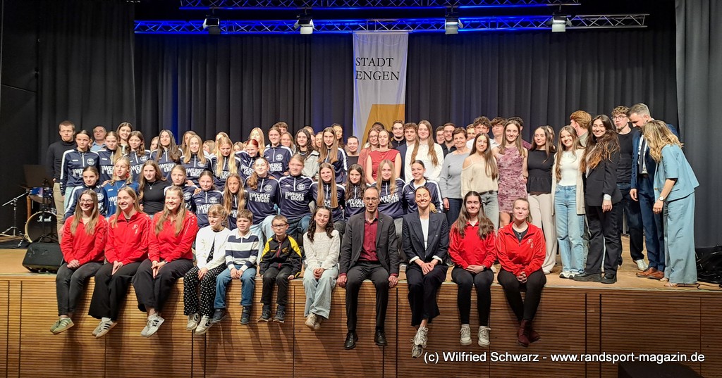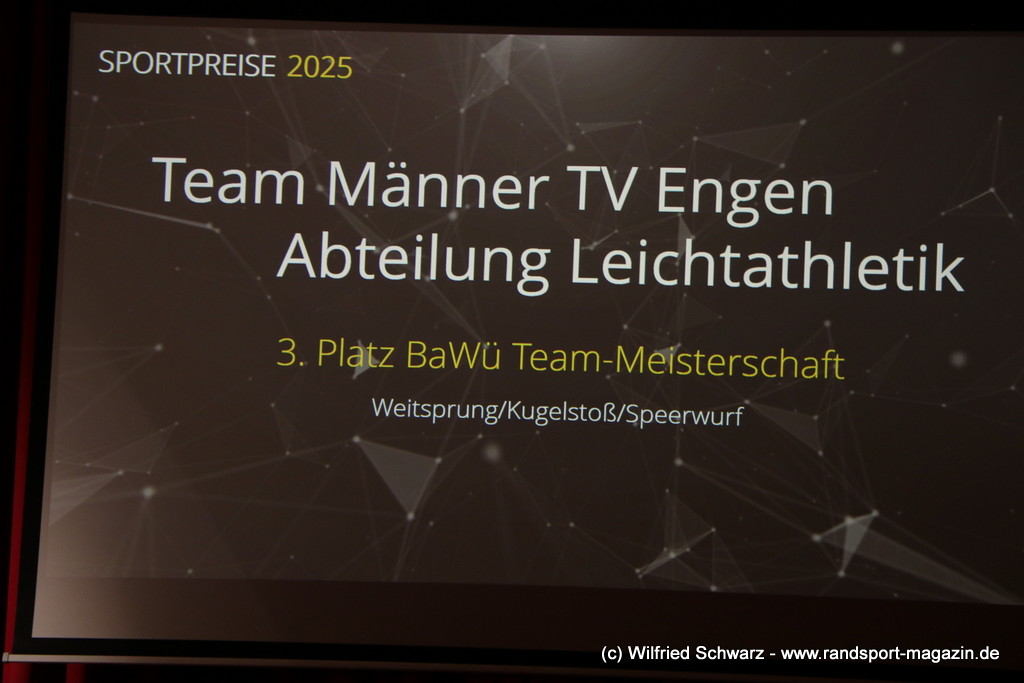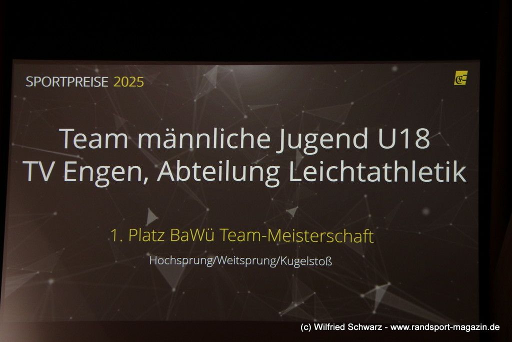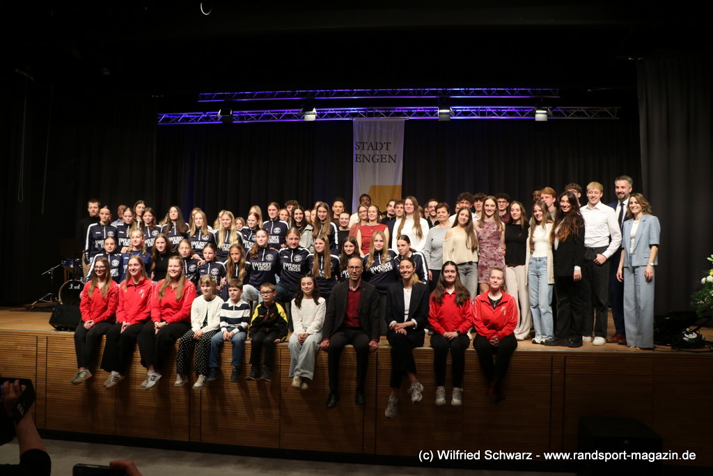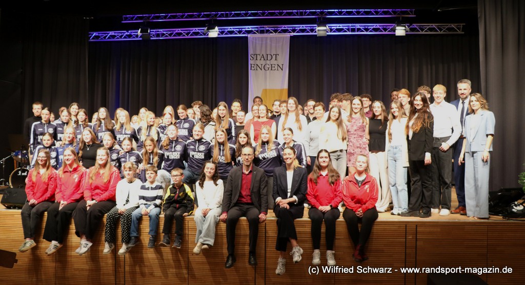 Die beeindruckende Zahl der Sportlerinnen und Sportler in den unterschiedlichsten Sportarten wie vielfältig das Angebot der Engener und Hegauer Vereine ist – und wie viele Menschen dieses begeistert nutzen. Es wurden Anerkennungspreise im Reiten, Leichtathletik und Turnen vom Sportausschuss vergeben. Sportpreise gab es für Erfolge an einer WM, EM, DM, Badischen oder Süddeutschen Meisterschaften in den Sportarten Tischtennis, Schießen, Fußball, Inline-Skating, Tanzen, Karate, Kunst- und Einrad. Einen Sonderpreis erhielt der Skiclub Engen als Verein des Jahres 2025 im Skiverband Schwarzwald. Weitere Sportpreise gab es im Dressur-Reiten, Western-Reiten, Berglauf und in der Leichtathletik.