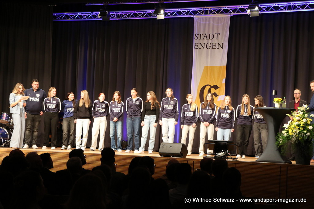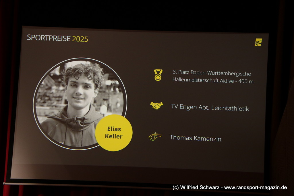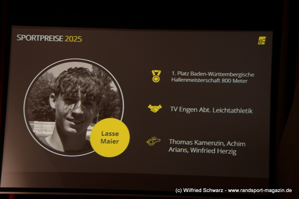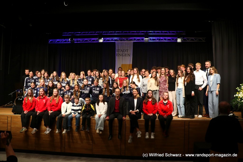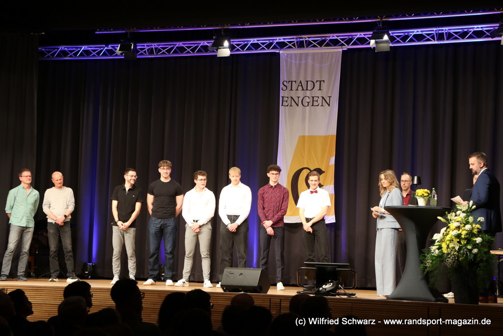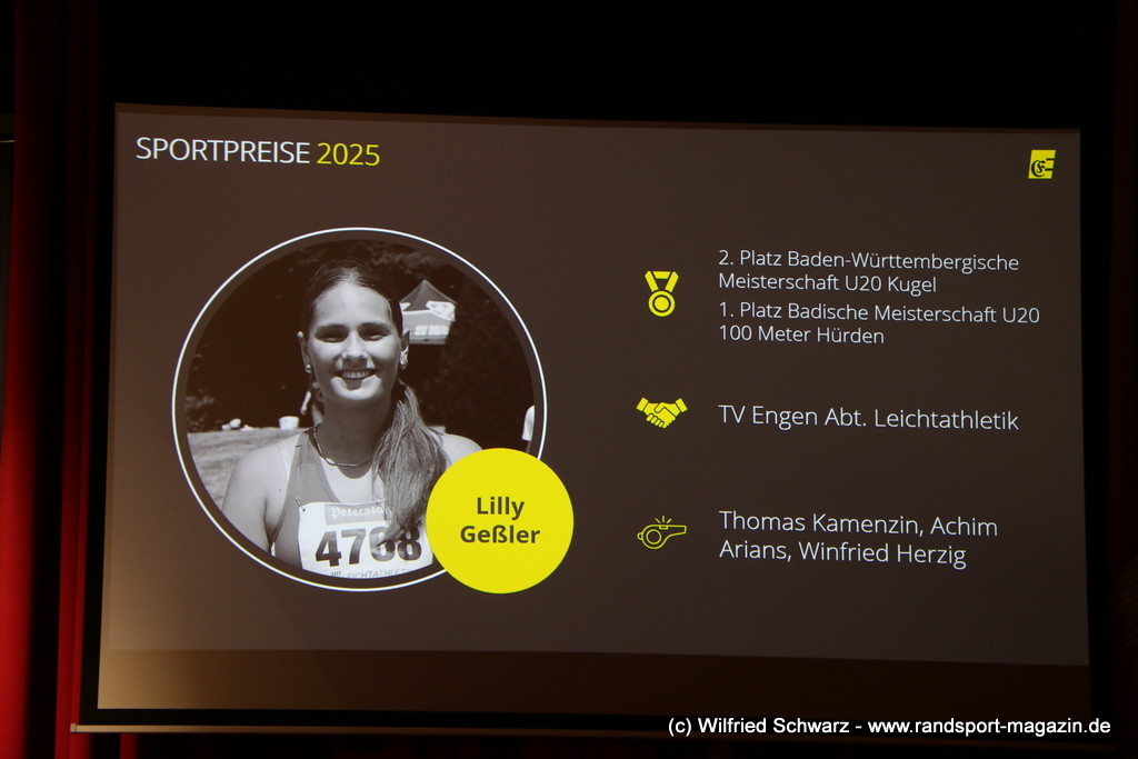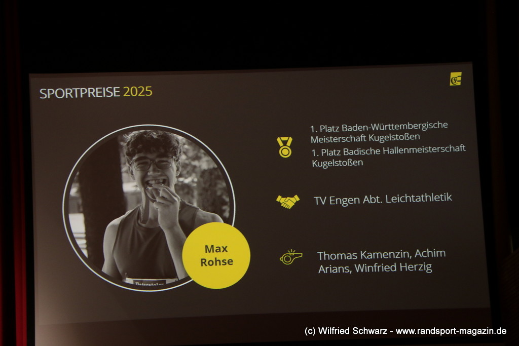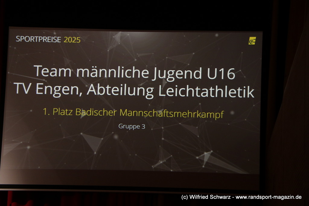 Die beeindruckende Zahl der Sportlerinnen und Sportler in den unterschiedlichsten Sportarten wie vielfältig das Angebot der Engener und Hegauer Vereine ist – und wie viele Menschen dieses begeistert nutzen. Es wurden Anerkennungspreise im Reiten, Leichtathletik und Turnen vom Sportausschuss vergeben. Sportpreise gab es für Erfolge an einer WM, EM, DM, Badischen oder Süddeutschen Meisterschaften in den Sportarten Tischtennis, Schießen, Fußball, Inline-Skating, Tanzen, Karate, Kunst- und Einrad. Einen Sonderpreis erhielt der Skiclub Engen als Verein des Jahres 2025 im Skiverband Schwarzwald. Weitere Sportpreise gab es im Dressur-Reiten, Western-Reiten, Berglauf und in der Leichtathletik.