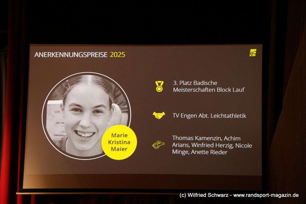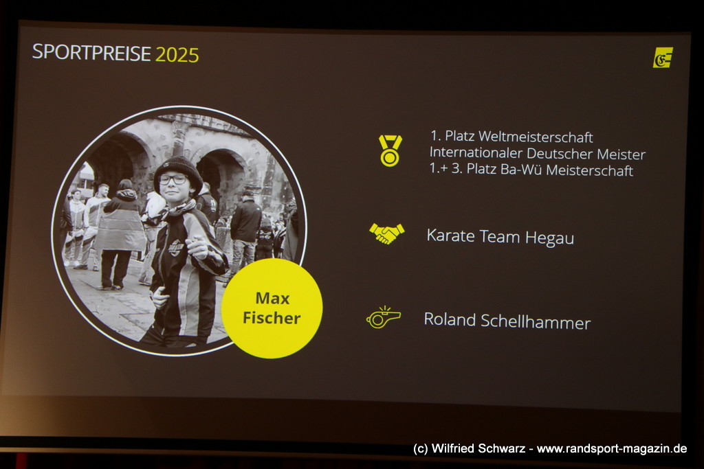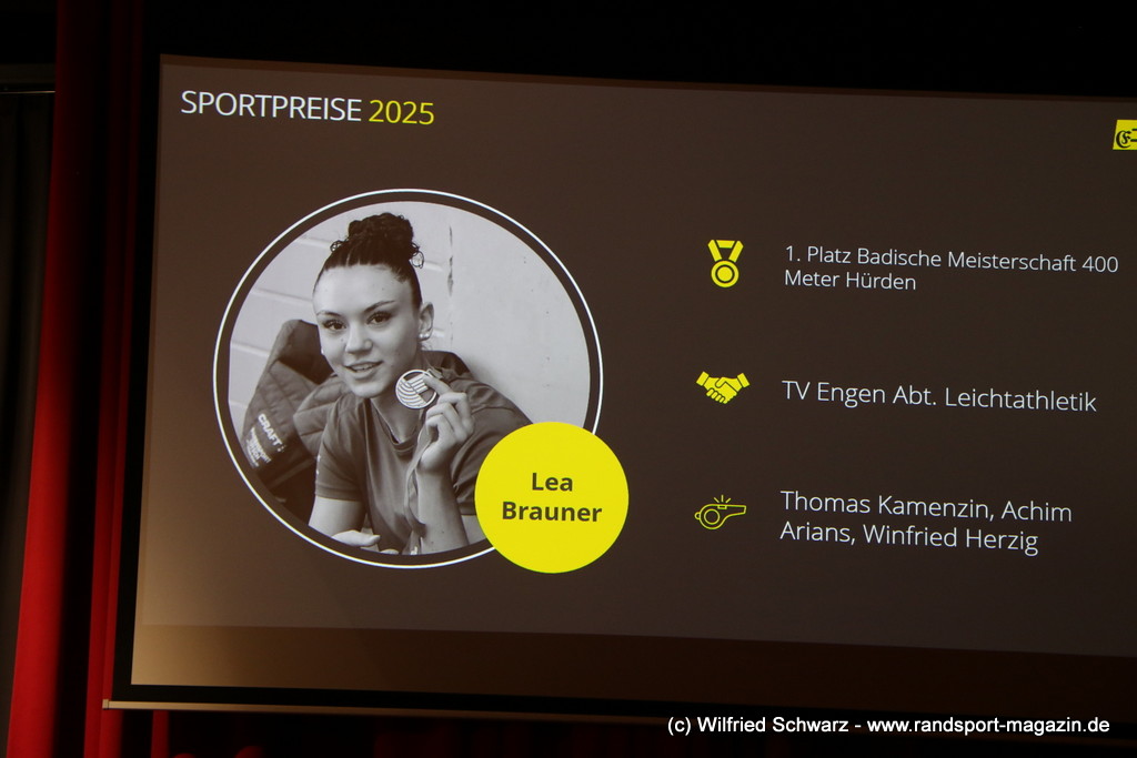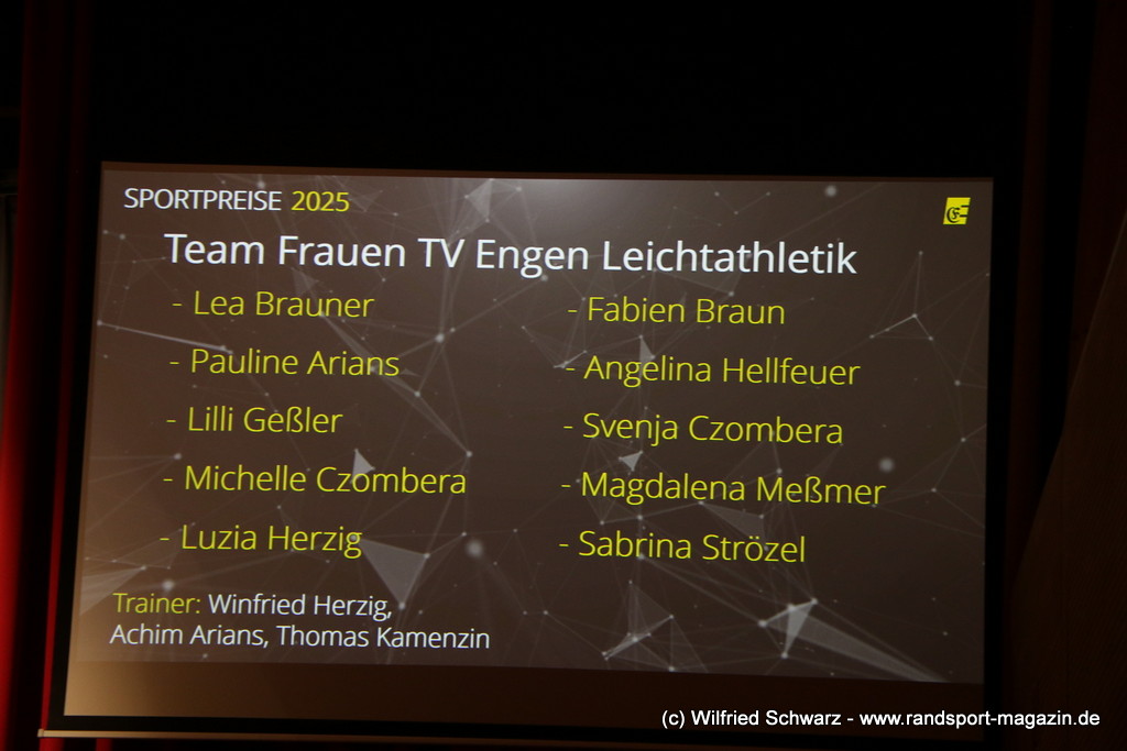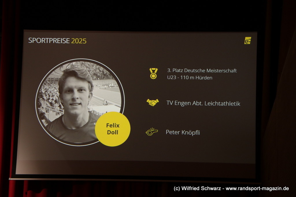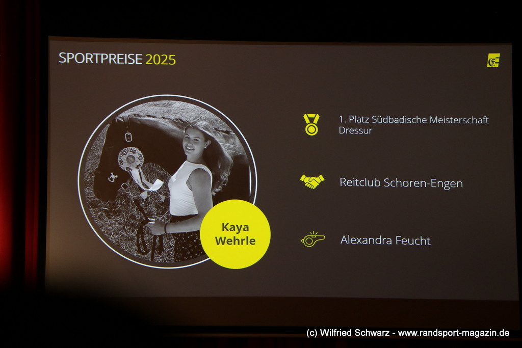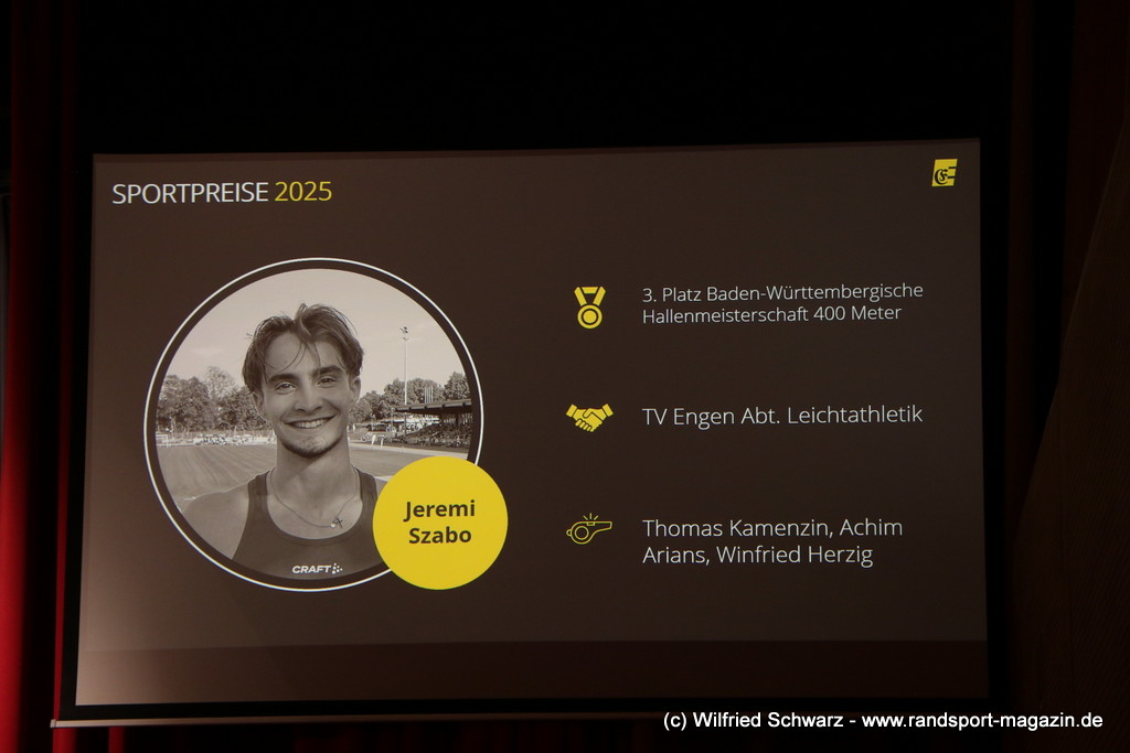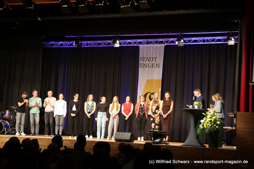 Die beeindruckende Zahl der Sportlerinnen und Sportler in den unterschiedlichsten Sportarten wie vielfältig das Angebot der Engener und Hegauer Vereine ist – und wie viele Menschen dieses begeistert nutzen. Es wurden Anerkennungspreise im Reiten, Leichtathletik und Turnen vom Sportausschuss vergeben. Sportpreise gab es für Erfolge an einer WM, EM, DM, Badischen oder Süddeutschen Meisterschaften in den Sportarten Tischtennis, Schießen, Fußball, Inline-Skating, Tanzen, Karate, Kunst- und Einrad. Einen Sonderpreis erhielt der Skiclub Engen als Verein des Jahres 2025 im Skiverband Schwarzwald. Weitere Sportpreise gab es im Dressur-Reiten, Western-Reiten, Berglauf und in der Leichtathletik.