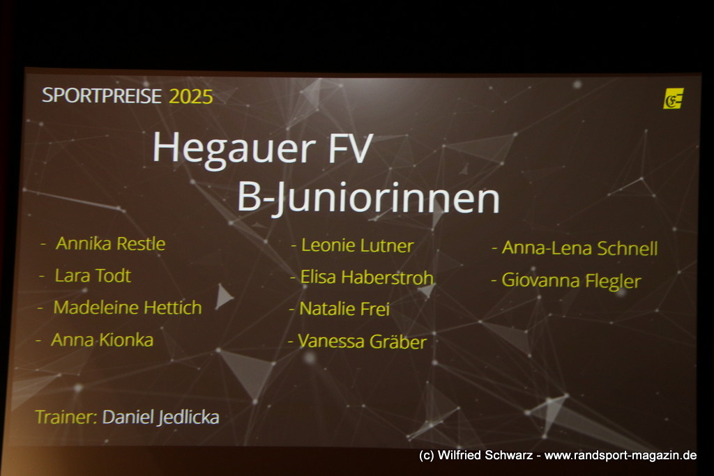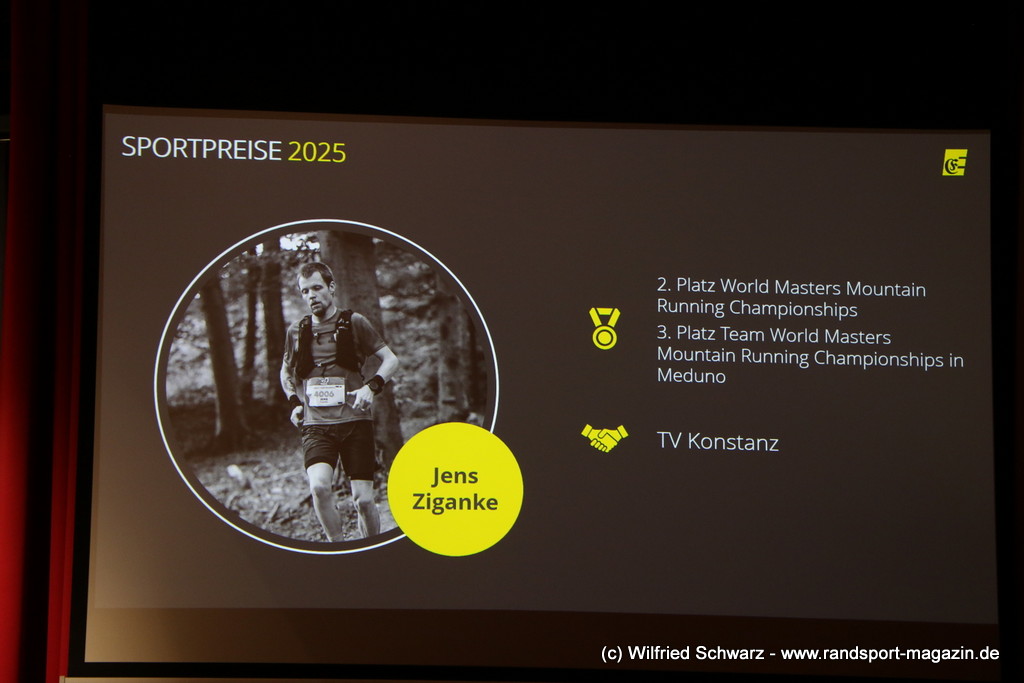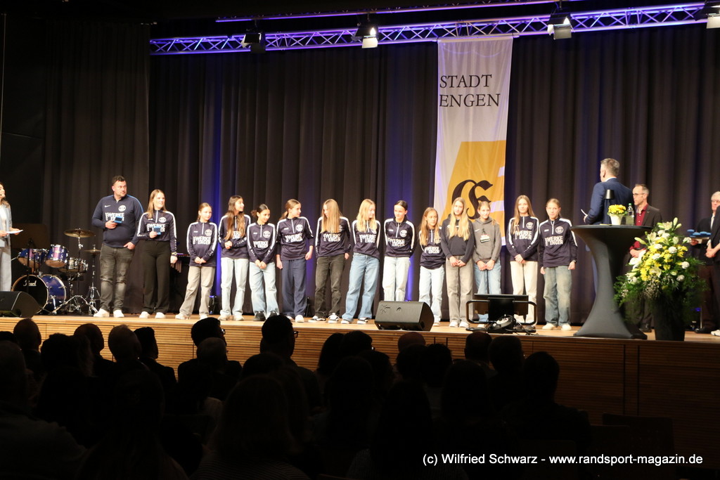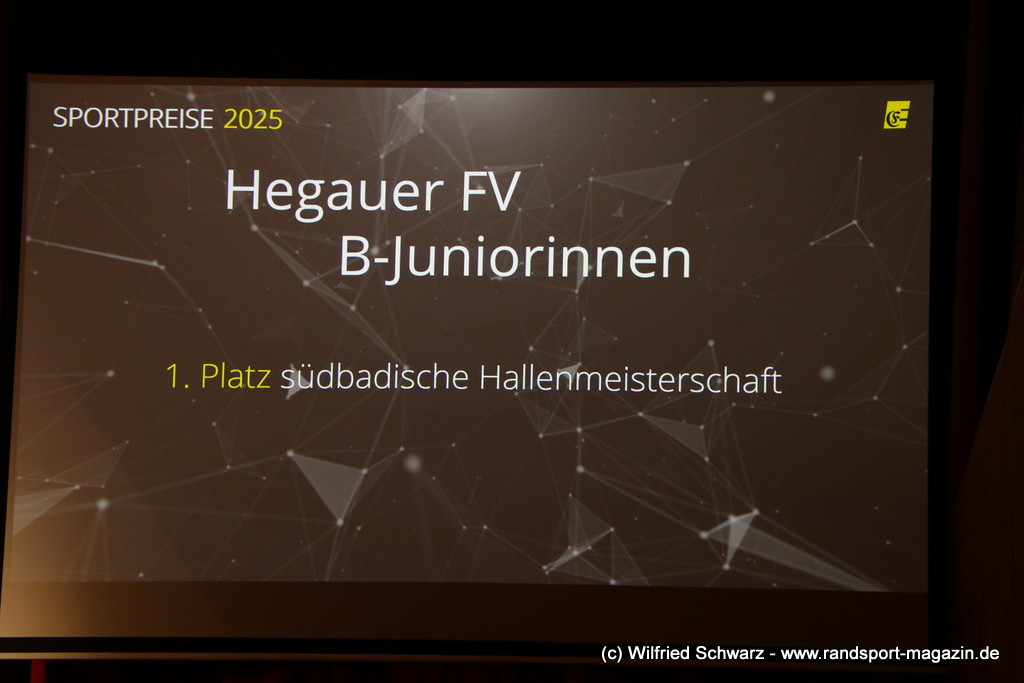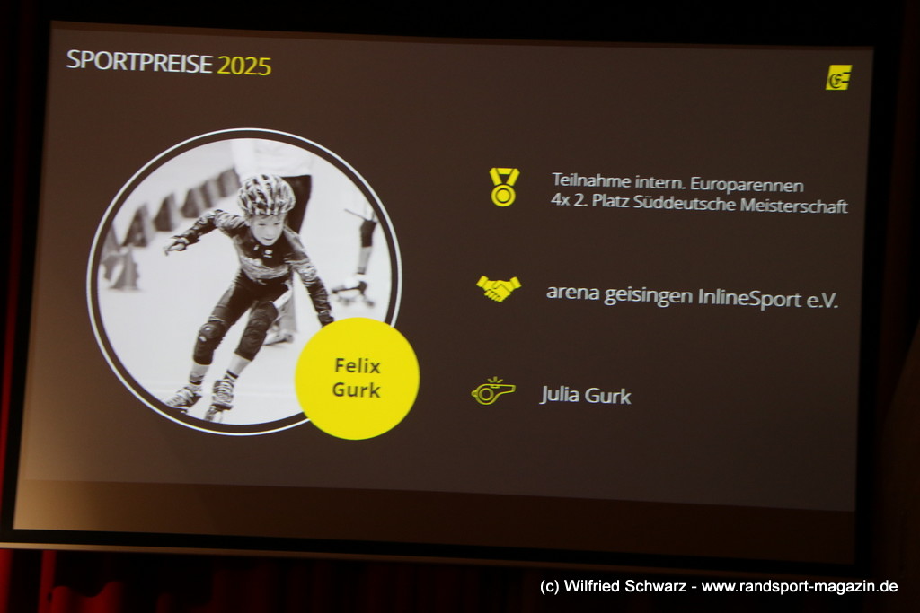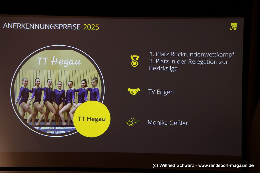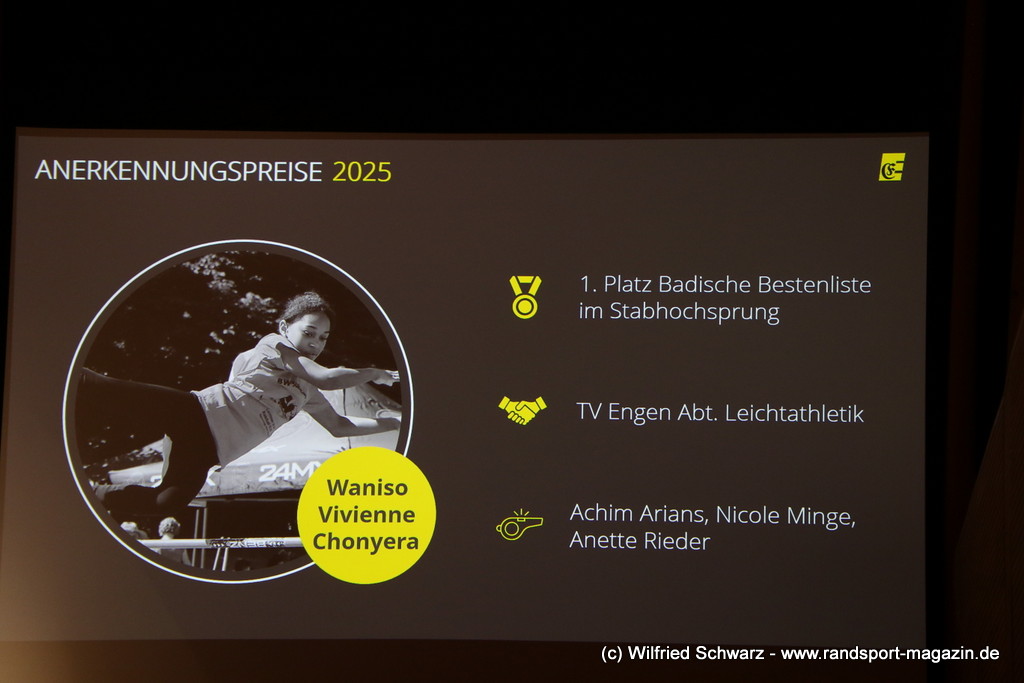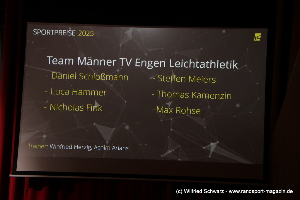 Die beeindruckende Zahl der Sportlerinnen und Sportler in den unterschiedlichsten Sportarten wie vielfältig das Angebot der Engener und Hegauer Vereine ist – und wie viele Menschen dieses begeistert nutzen. Es wurden Anerkennungspreise im Reiten, Leichtathletik und Turnen vom Sportausschuss vergeben. Sportpreise gab es für Erfolge an einer WM, EM, DM, Badischen oder Süddeutschen Meisterschaften in den Sportarten Tischtennis, Schießen, Fußball, Inline-Skating, Tanzen, Karate, Kunst- und Einrad. Einen Sonderpreis erhielt der Skiclub Engen als Verein des Jahres 2025 im Skiverband Schwarzwald. Weitere Sportpreise gab es im Dressur-Reiten, Western-Reiten, Berglauf und in der Leichtathletik.